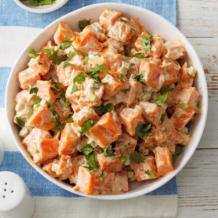 I love the velvety taste and texture of sweet potatoes. A friend served sweet potatoes cooked with peppers, and they tasted so delicious together. I took those flavors and developed them into this creamy, smoky potato salad. —Carolyn Eskew, Dayton, Ohio