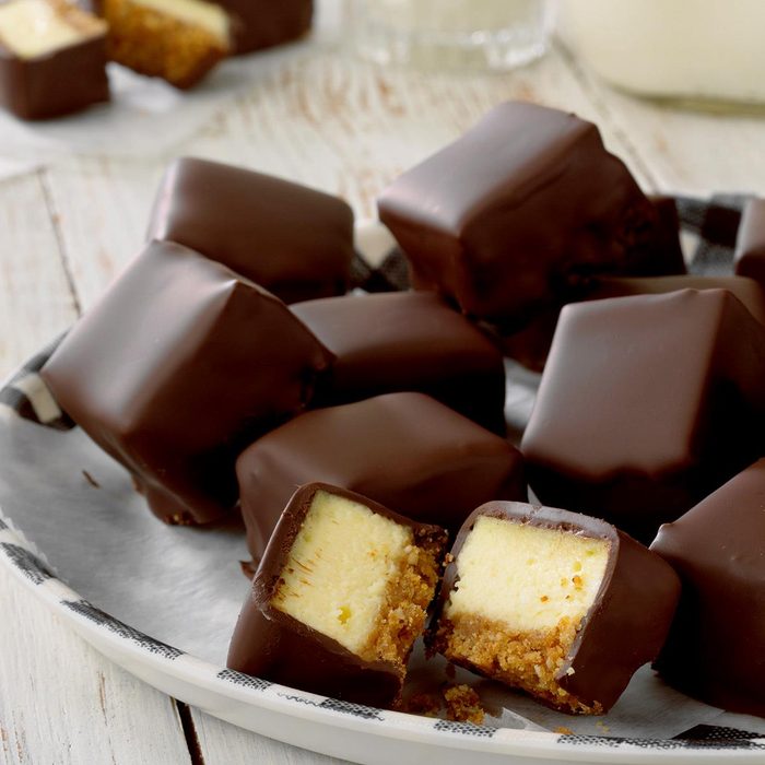 Satisfy your cheesecake craving with these bite-sized treats. Dipped in chocolate, the sweet, creamy delights are party favorites. But be warned…you won’t be able to eat just one! —Esther Neustaefer, La Crete, Alberta