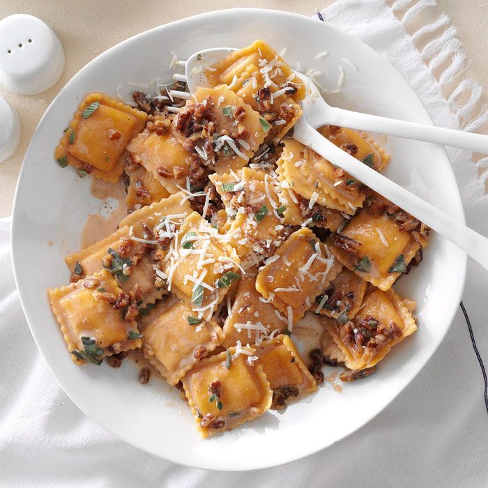 This ravioli recipe idea is a cold weather winner. It has colorful squash and spinach with a toasted walnut crunch in a cream sauce. Could ravioli recipe ideas get any better?
