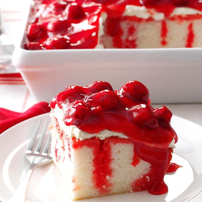 I serve this cherry cake for holidays because it’s so festive and easy. No one will know your secret is adding a package of cherry gelatin to a boxed cake mix! —Margaret McNeil, Germantown, Tennessee