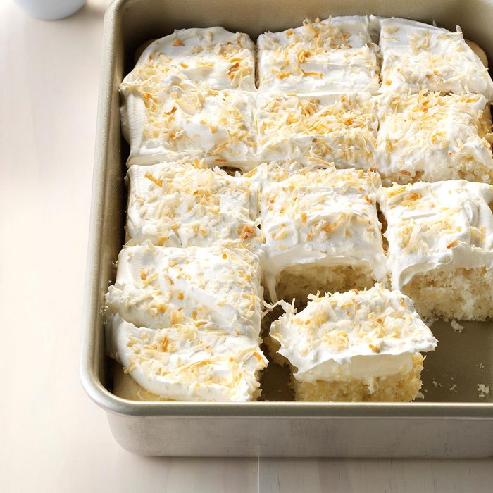 We named this a “pina colada” cake because it has coconut, pineapple and rum. It’s a soothing finish at the end of a big spread. —Debra Keil, Owasso, Oklahoma
