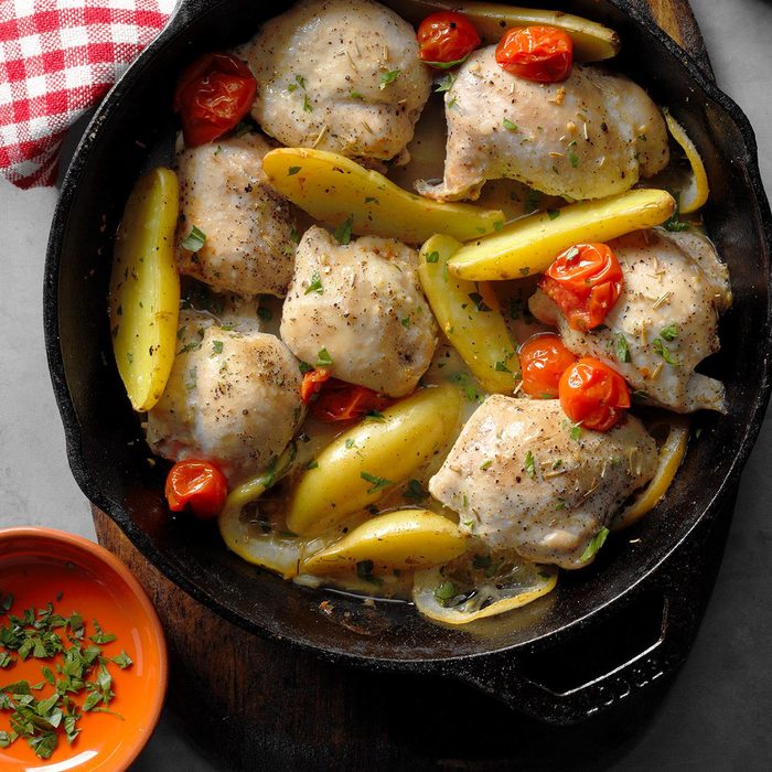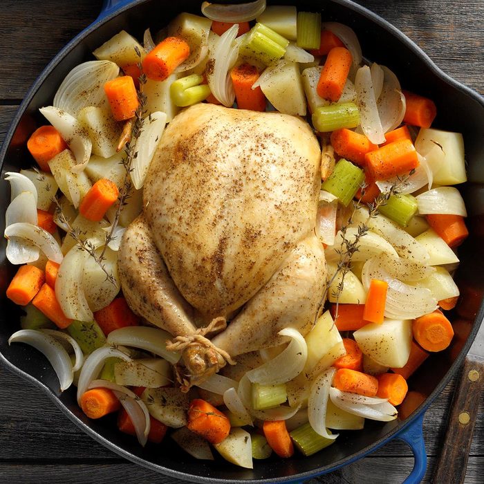 This one-dish roast chicken with vegetables tastes as if it took hours of hands-on time to put together, but the simple ingredients can be prepped in mere minutes. The rosemary gives it a rich flavor, and the meat juices cook the veggies to perfection. It’s unbelievably easy! —Sherri Melotik, Oak Creek, Wisconsin