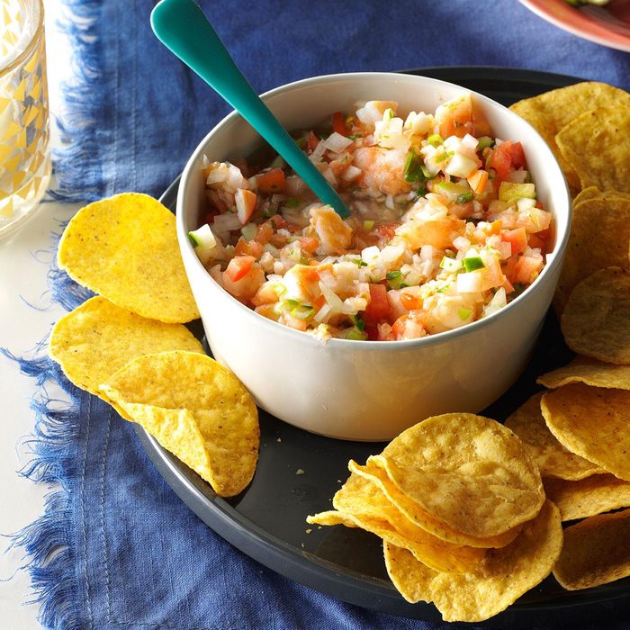 Ceviche is a seafood dish of raw fish marinated in citrus juice, which “cooks” the fish without heat. This version starts with cooked shrimp and adds tomatoes, cucumbers and serrano peppers. —Adan Franco, Milwaukee, Wisconsin. Next, learn how to make shrimp ceviche.