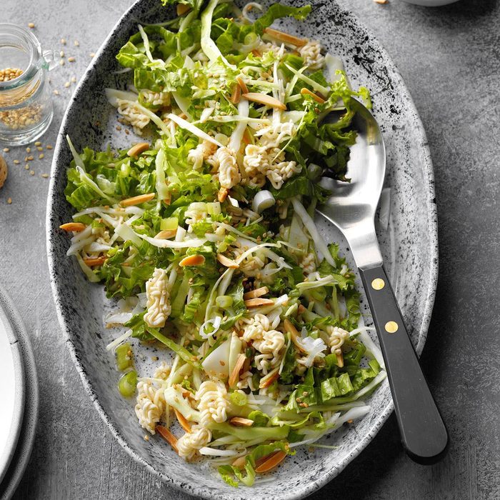 For potlucks and picnics, this ramen noodle salad is a knockout. I tote the veggies in a bowl, dressing in a jar and noodles in a bag. Then I just shake them all together when it's time to eat. —LJ Porter, Bauxite, Arkansas