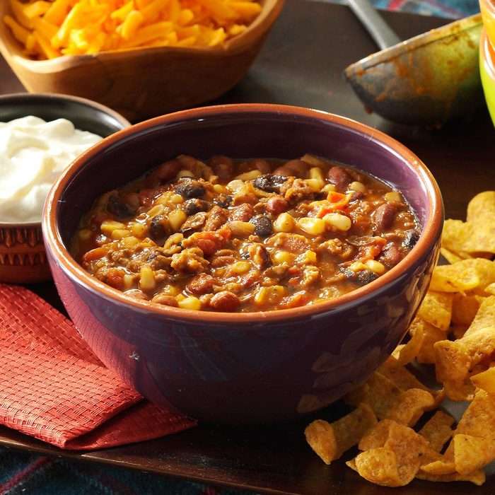 From the Recipe Creator: Ranch dressing mix and taco seasoning give extra special flavor to my hearty chili. Folks will come back for seconds. —Julie Neuhalfen, Glenwood, Iowa