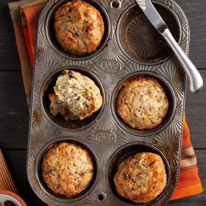 These yummy zucchini muffins, packed full of currants and walnuts, are an excellent way to use up your garden overload of zucchini. —Peg Gausz, Watchung, New Jersey