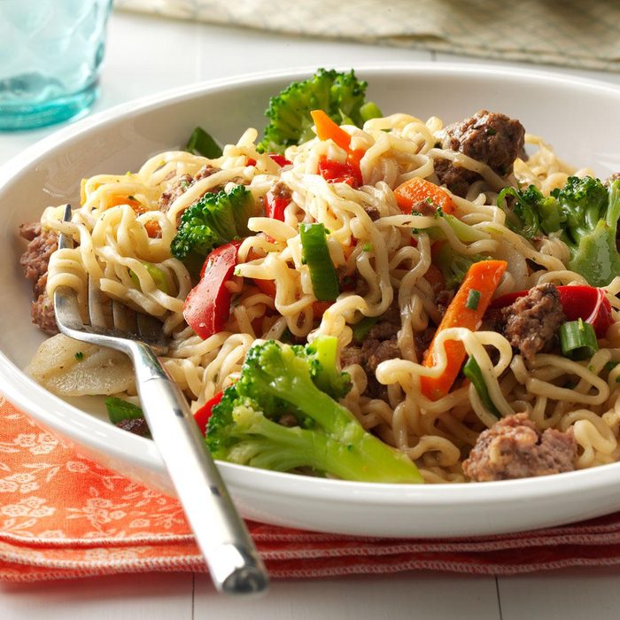 Here’s a quick, easy hamburger stir-fry that uses ground meat instead of the traditional beef strips. It has a nice sauce and is different enough to feel like a treat for the taste buds! —Kathi and John Horst, Westfield, New York. Next, try this dairy-free vegan stir-fry recipe.