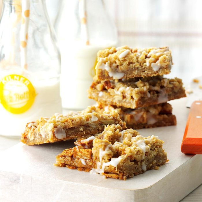I made these delicious bars for a friend’s birthday once and now he requests them every year! They have a tasty tartness with a cinnamony kick. Be sure to chop the apples into small cubes—if the apple pieces are too big, the bars will fall apart. —Danielle Millwer, Tonawanda, New York