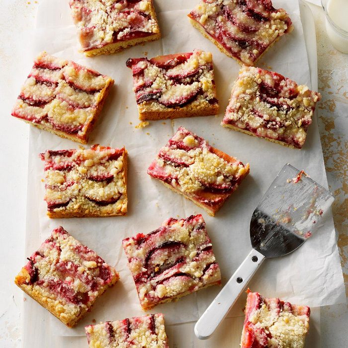This recipe is actually called “platz” in German (meaning “flat”) and has been in my family since before I was born. The fresh fruits of summer make it a favorite, and it’s simply wonderful warm out of the oven. We enjoy this German plum cake with ice cream or whipped cream, too. —Lisa Warkentin, Winnipeg, Manitoba