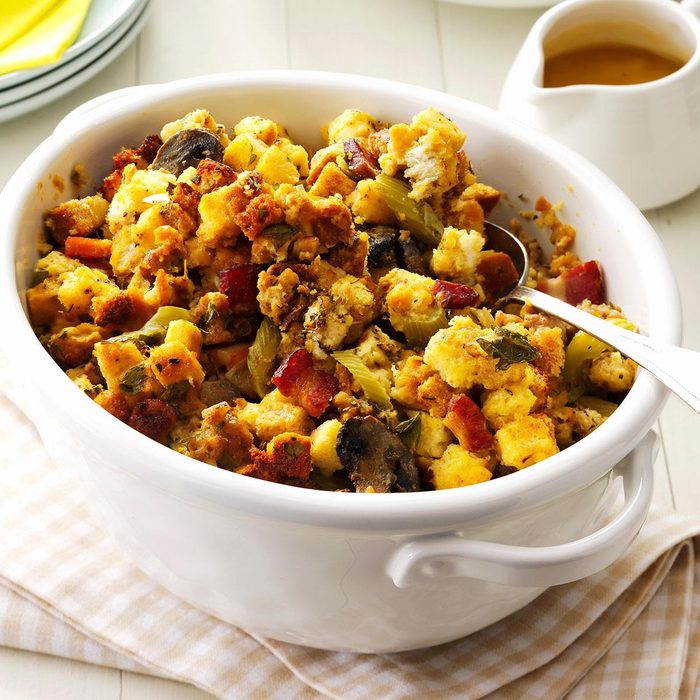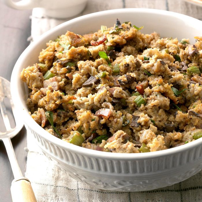 A hearty cornbread mix combines with mushrooms and bacon for a spectacular result. This dressing is creamy and soft.