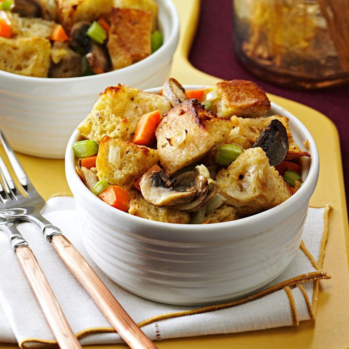 Sourdough is a nice change of pace from your usual prepackaged stuffing mixes. The natural tang blends nicely with the mushrooms and celery. This stuffing is great for a small night in, or you can double it for a larger crowd.