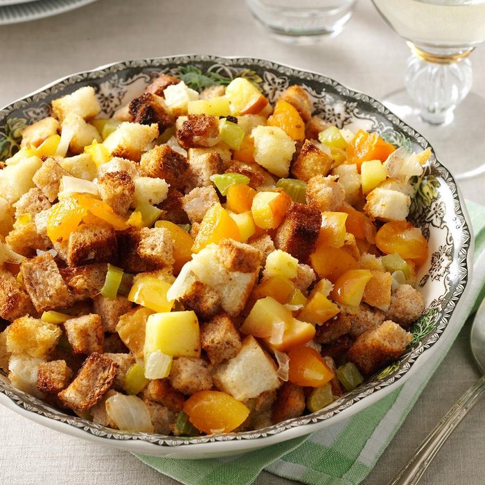 This fruit and veggie stuffing is both sweet and tart. The apricots give it a nice orange coloring that will brighten your Thanksgiving table.