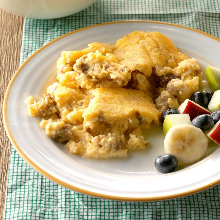 From the Recipe Creator: For the perfect combination of eggs, sausage, bread and cheese, this is the dish to try. My mom and I like this sausage breakfast casserole because it bakes up tender and golden, slices beautifully and goes over well whenever we serve it. —Gayle Grigg, Phoenix, Arizona