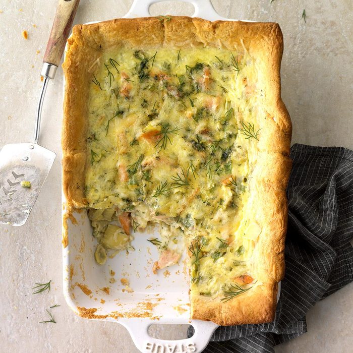 From the Recipe Creator: Salmon, goat cheese and artichoke hearts make this quiche feel a little fancy and taste extra delicious. Baked in an 11x7-inch dish, it comes together in a snap and makes enough to serve a hungry brunch crowd. —Jeanne Holt, Mendota Heights, Minnesota