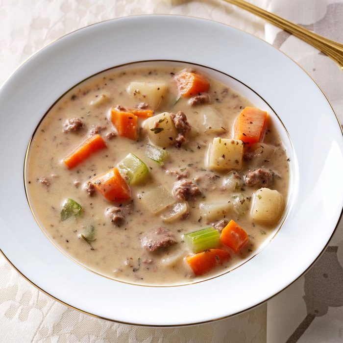 At family get-togethers, our children always request this spirit-warming soup along with a fresh loaf of homemade bread and tall glasses of milk. It has robust flavor and plenty of fresh-tasting vegetables, and it's so easy to make. —Barbara Brown, Janesville, Wisconsin