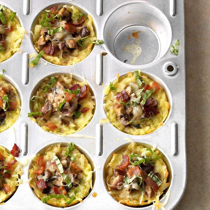 Hash browns make a fabulous crust for these individual egg quiches, which look fancy yet are actually easy to make. They've been a hit at holiday brunches and other special occasions.—Kate Meyer, Brentwood, Tennessee