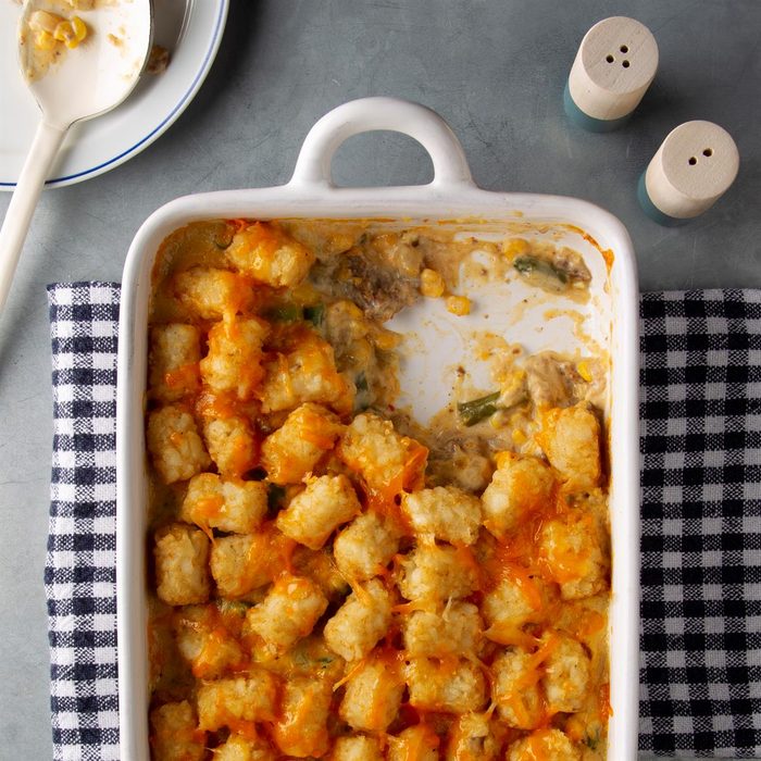 This casserole or, as Minnesotans like to call it, hot dish uses ground beef, mushroom soup, frozen Tater Tots and cheese for its charming taste. It’s a must-try Midwestern recipe that’s simple, easy and filling. —Taste of Home Test Kitchen