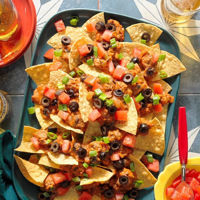 My beef nachos recipe is quite the tasty topper for tortilla chips. Chili powder and sassy salsa season a zesty mixture of ground beef and refried beans that’s sprinkled with green onions, tomatoes and ripe olives. —Diane Hixon, Niceville, Florida