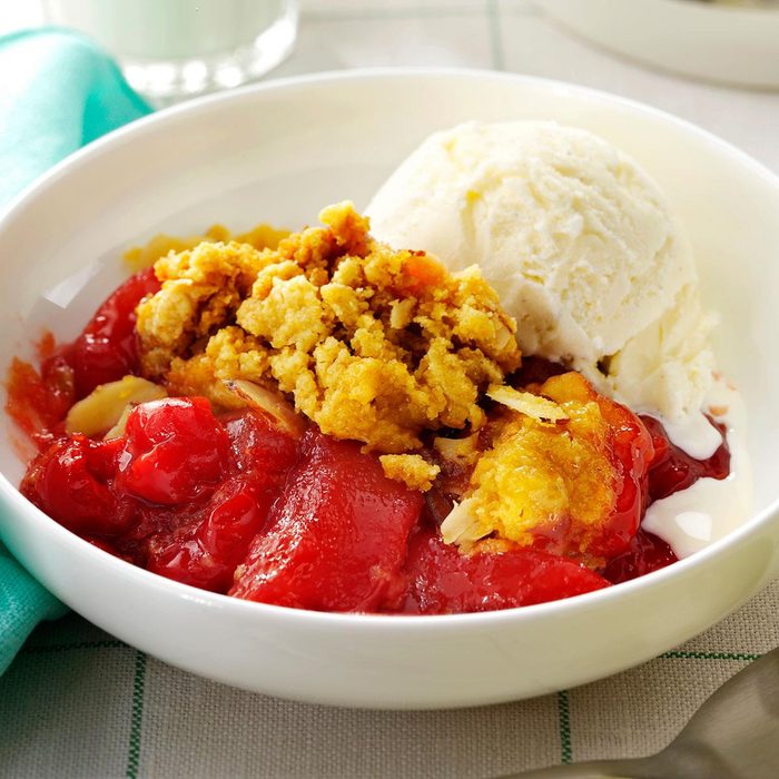 The first time I made this delightful crisp, my ice cream-loving brother skipped his usual scoop of vanilla—because he wanted to taste the cherries better! We grow wheat, soybeans and milo on our farm, plus three small cherry trees. I save every cherry for this recipe. —Carole Schlender, Burrton, Kansas