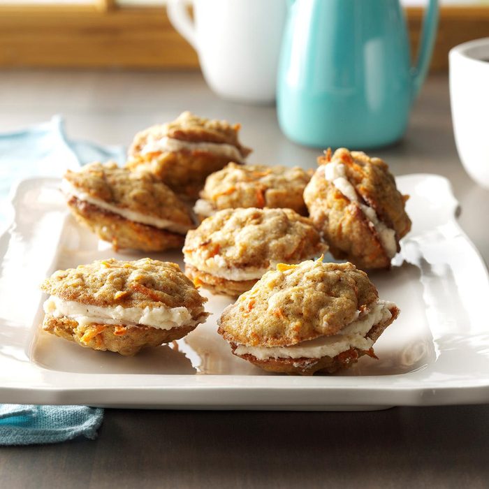 Carrot cake is a family favorite, and these delicious cookies taste just like it with shredded carrots, dried cranberries, toasted walnuts, cinnamon and cloves. And they’re topped with a rich cream cheese frosting. Who could resist? Each cookie is like eating a piece of carrot cake, but with no fork needed! —Susan Bickta, Kutztown, Pennsylvania