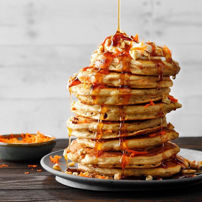 Here’s a way for fans of carrot cake to have their favorite dessert for breakfast. These delicate, decadent pancakes are drizzled with sweet and spicy maple syrup that complements the sour cream and nut topping. —Leane Goering, Salem, Indiana