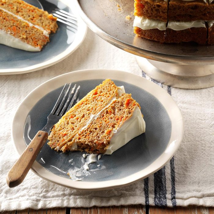 A pleasingly moist cake, this treat is the one I requested that my mom make each year for my birthday. It's dotted with sweet carrots and a hint of cinnamon. The fluffy buttery frosting is scrumptious with chopped walnuts stirred in. One piece of this carrot cake with cream cheese frosting is never enough—it's better than all the other carrot cakes I've tried! —Kim Orr, West Grove, Pennsylvania