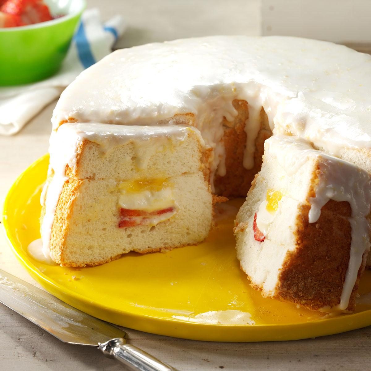 For a sunny angel food cake, we make a filling of mascarpone, cream cheese and lemon curd, and then drizzle...