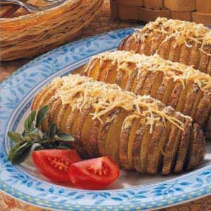 These wonderful oven-roasted potatoes are very pretty to serve—the partially cut slices spread out in the shape of a fan....