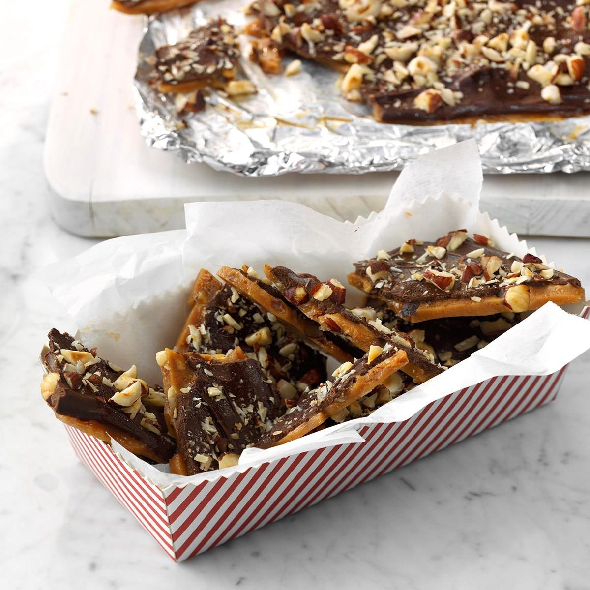 This crunchy toffee is covered with milk chocolate and topped off with a generous sprinkling of pecans.—Janice Cranor, Bartlesville, Oklahoma