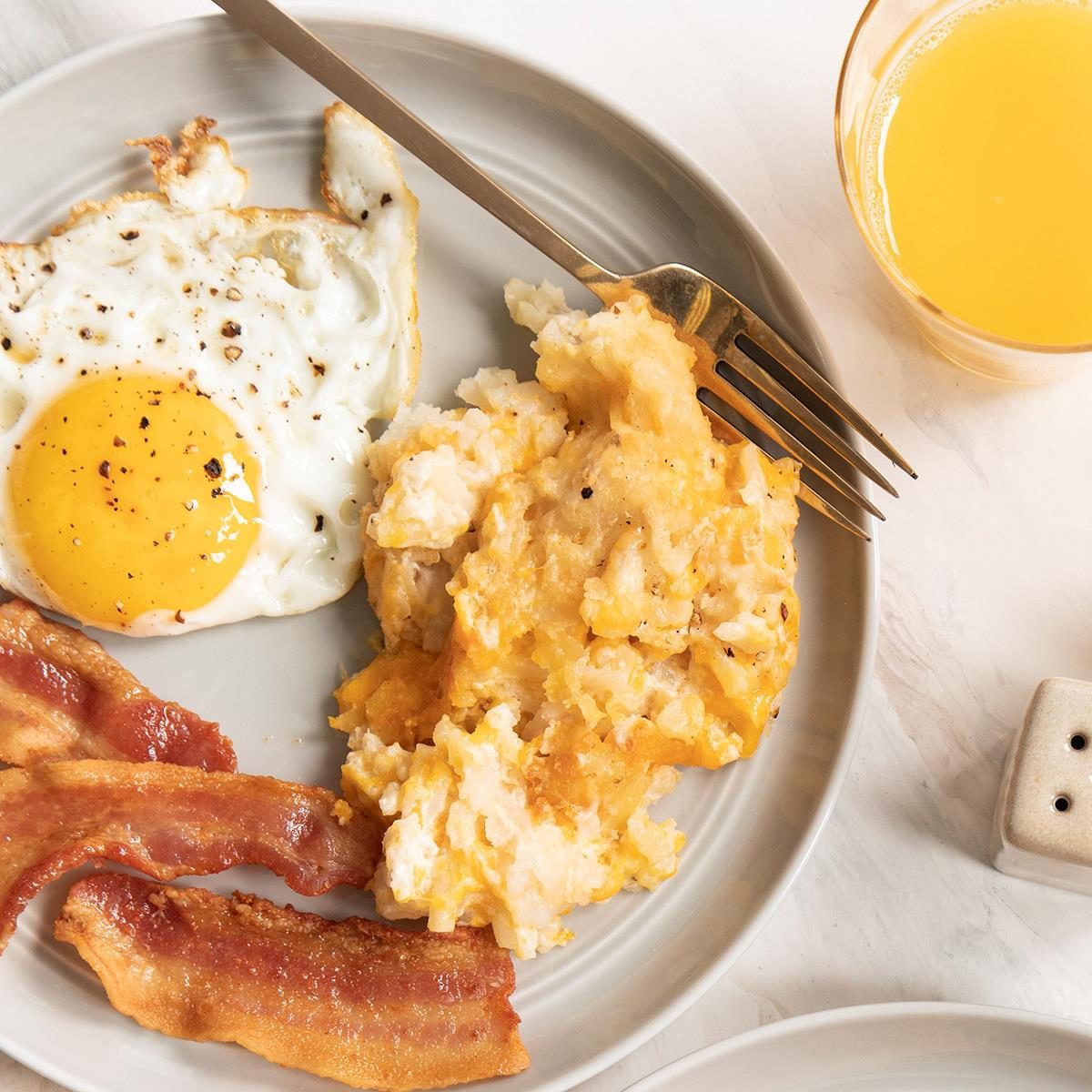 Serve up comfort food for breakfast with this cheesy casserole featuring frozen hash browns. It requires just 10 minutes of...