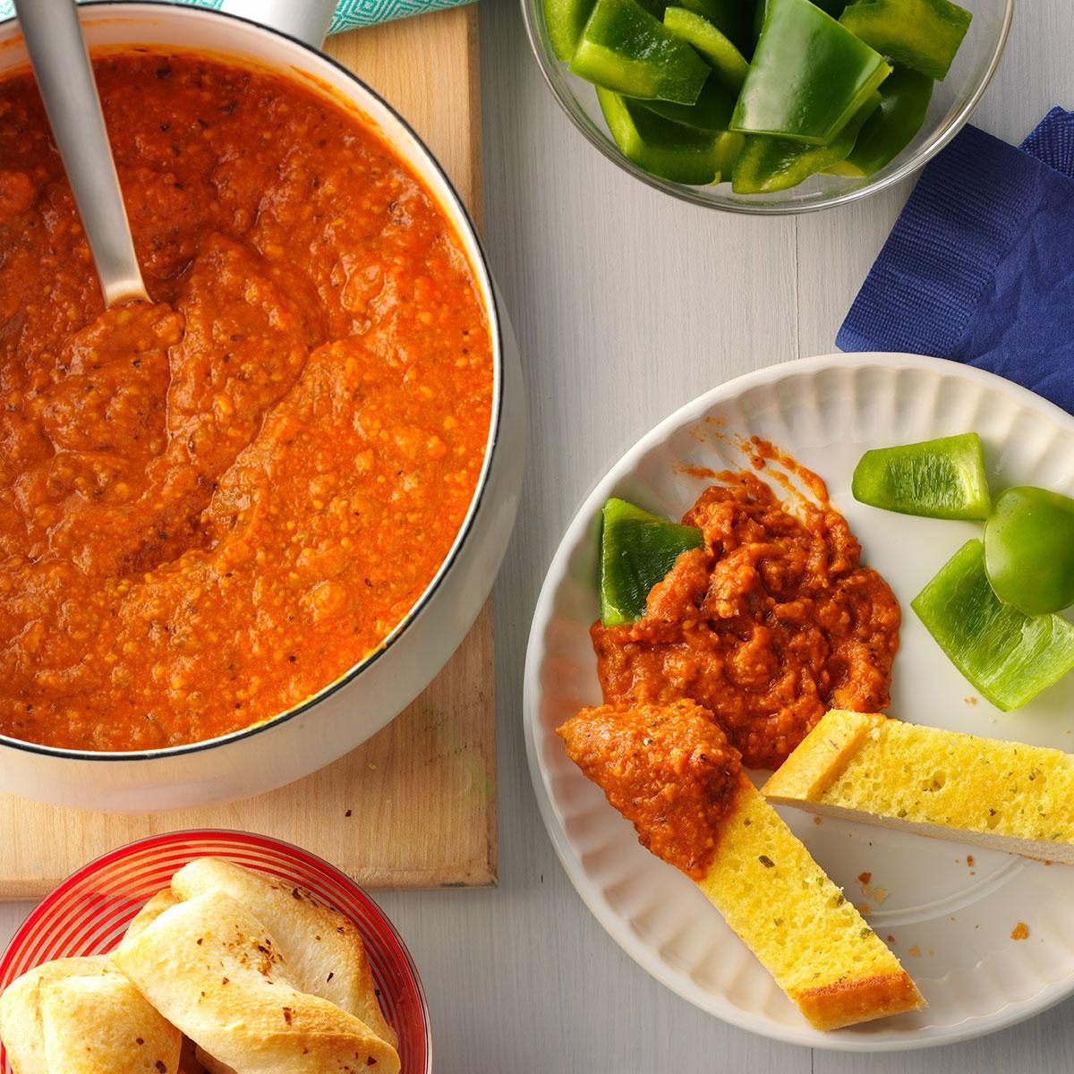 We grill peppers with rosemary and garlic, then blend them with sun-dried tomatoes for a creamy spread to pass with...