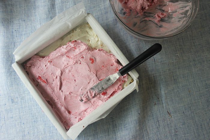 To make the first layer of the strawberry ice cream cake, grab your favorite vanilla ice cream—this is our Test Kitchen’s favorite brand. Allow it to sit out for a bit on the counter so it’s easy to spread. When it’s soft, but not runny, spread an even layer across the graham crackers. Be careful so you don’t mess up your crust. Then pop it in the freezer to get it nice and firm, about an hour.