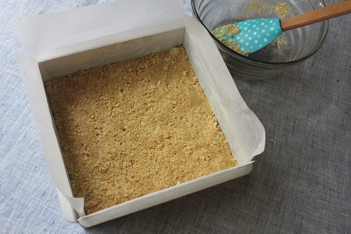 When you’ve got crumbs—somewhere between a powder and coarse crumbles—stir them together with the melted butter. Press into an 8×8-inch pan lined with parchment. Pop this into a 350ºF oven for about 20 minutes. Once baked, let it come to room temperature.