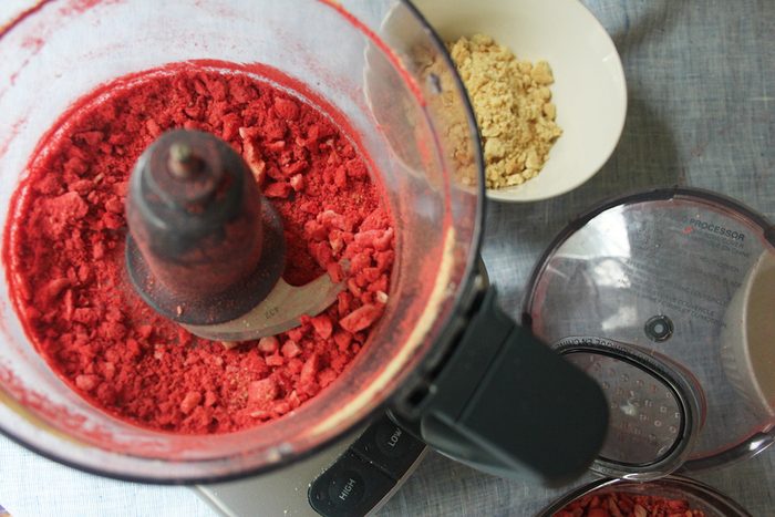 Then process the freeze-dried strawberries. We recommend crumbling them up separately from the cookies because they will turn the whole batch dark pink. The taste will be the same, but by separating them at this stage you’ll get a more impactful two-tone effect later. When you’re ready to use the cookie-berry crunch, toss them together lightly.