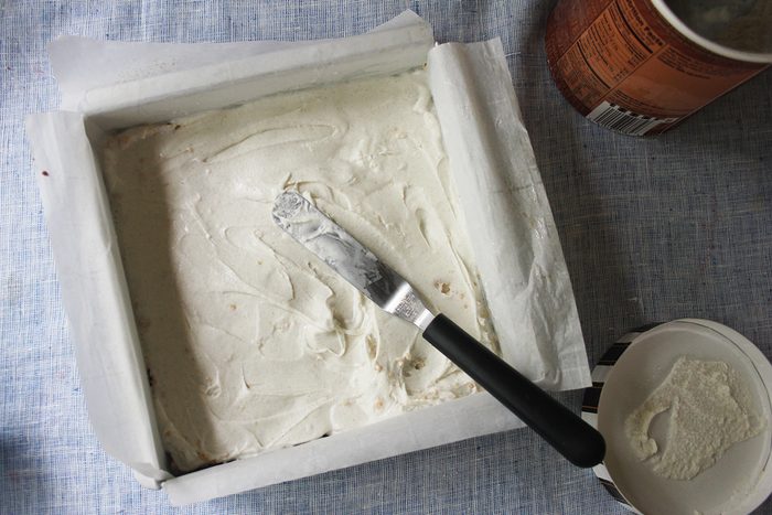 With the ice cream layers nice and firm, you can remove the 8×8 pan from the freezer. Layer on some whipped topping. Use as much or as little as you like. Pop this in the freezer one more time. It’s a lot of back and forth with the freezer, but this helps the layers really set up ensuring you get beautiful layers when it’s time to slice.