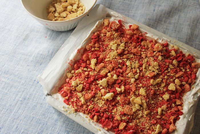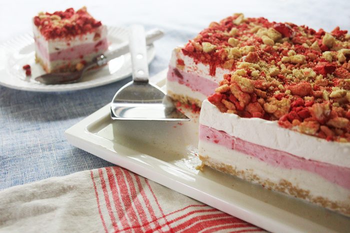 - Coarsely crush remaining cookies. Combine cookie crumbs and freeze-dried strawberries; sprinkle over whipped topping. Freeze, covered, until firm, 8 hours or overnight. Remove cake from freezer. Lifting with parchment, remove from pan. Gently peel off parchment. Let stand 10 minutes before cutting. If desired, garnish with fresh strawberries.