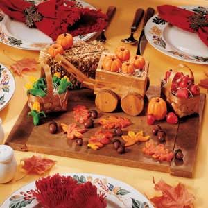 YOUR HARVEST will be happy indeed when you reap this sweet centerpiece. To create the topper, CT home economists first turned to this age-old idea traditionally used during Christmas—marzipan candy. Then they cultivated it with autumn in mind and turned out this country-fresh fall decoration. As you may know, marzipan, an edible modeling clay, is a mixture of sugars and sweet almond paste (available in the baking section of grocery stores) that can be tinted and shaped into all sorts of decorations… just like those featured here. Since it’s so sweet, this table topper can be passed around for dessert when your meal is complete. Or you might choose to use the design solely as a centerpiece you bring out autumn after autumn. Simply place it in an airtight container between parties—it’ll harden and stay colorful for years to come!